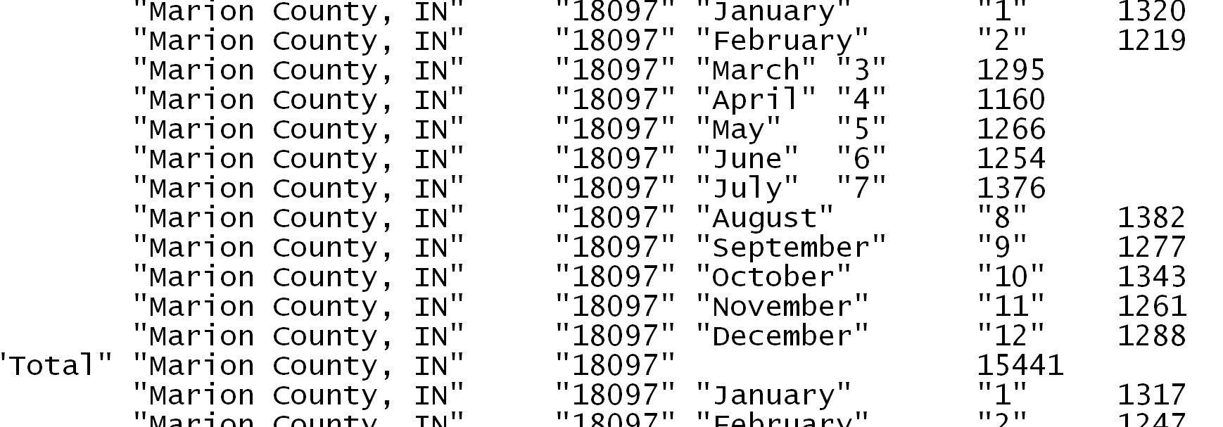 Babies_2007.txt: “Marion County, IN” “18097” “February” “2” 1219
