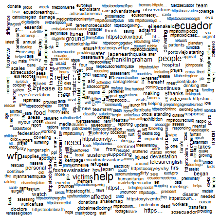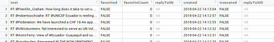pull <- searchTwitter(“#EcuadorEarthquake”, n=1000, lang=”en”)