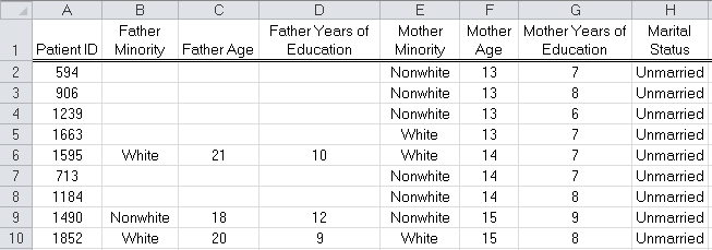 You can easily apply a filter on multiple variables. Each additional variable you add will narrow down your list, as records have to meet each set of criteria in order to be displayed. For example, consider the subset Father Minority = Nonwhite and Mother Minority = Nonwhite.