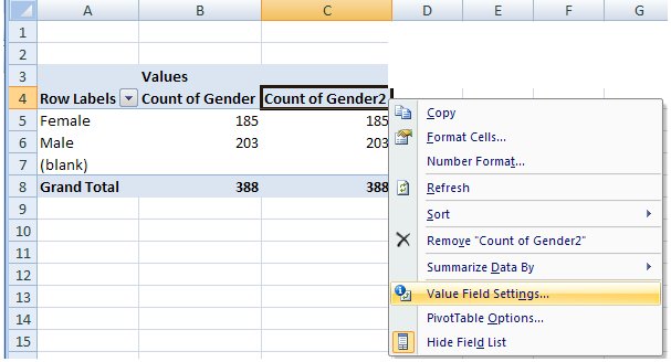 For example, suppose the variable of interest is Gender. To create a pivot table for Gender, first place Gender in the Axis Fields box. Next, you must tell Excel what you want to do with Gender. Dragging Gender into the Values box will create a Count of Gender.