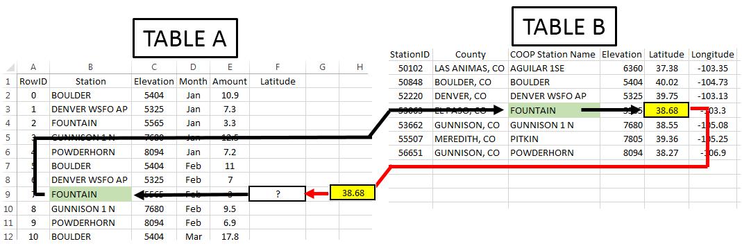 A data scientist must often merge data from one table into another table. The discussion here will again use the subset of the CO snowfall data from above. Table A consists of the stacked data from the example discussed above. Table B contains information auxiliary information for various stations in CO.