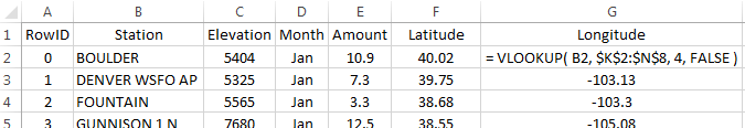 =INDEX(StationInfo!$A$2:$N$3091,E2,4)Some software packages will create maps based on county names. However, abbreviations for state must be included with the county name. Use the following formula to concatenate County with the state abbreviation for CO.