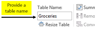 Putting Data into the Table structure in Excel Give your table a name for easy referencing |