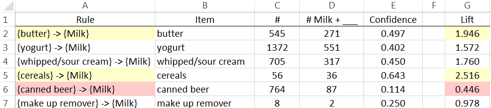 This formula can be copied down in Excel to evaluate the support for the remaining rules. The confidence and lift are computed for these rules as well.